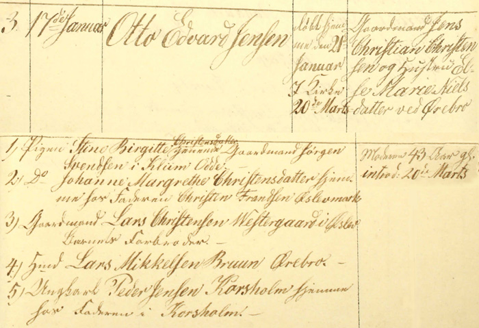 Blandt fadderne ved dpåben af Otto Edvard nævnes Gaardmand Lars Christensen Westergaard i Øslev, Barnets Farbroder.