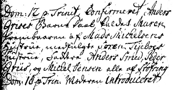 Anders Pedersen og Maren Rasmusdatter bliver gift i Støvring kirke den 8. maj 1778. [Støvring 1733-1799, opslag 144] Allerede her, ligesom i folketællingen 1787 ovenfor, har Anders Pedersen tilnavnet Griis. Både brudgom og brud er i følge kirkebogen 'af Støvring'. Anders er døbt i Støvring kirke den 16. februar 1749, og hans forældre er Peder Pedersen Griis og Kirsten Sørensdatter. Det fremgår blandt andet af hjemmesiden tagmaler.dk. Dette par er et af mormor Petras seksten tiptip oldeforældrepar. Griis-navnet er jo ret udsædvanligt og derfor nemt at søge på - og via Google er der en del henvisninger til netop Griis-slægten fra egnen omkring Støvring.