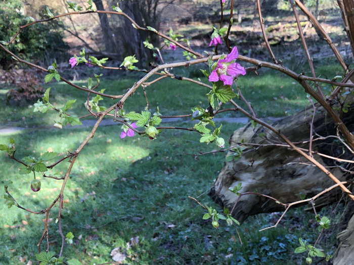 Busken er en slags brombær. Arten hedder Laksebær, Rubus Spectabilis. Den er