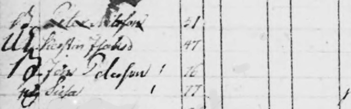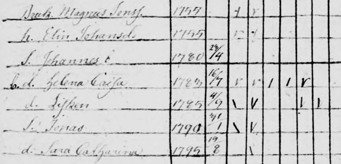 Vi finder familien med fem børn i Husförhör for lokaliteten Hufvudhult anno 1807. Vores ane Sara Catharina f. 1795 er det yngste af børnene. Magnus f. 1757 står opført med efternavnet Jonsson, ikke Johansson. Elin Johansdotter f. 1755 er to år ældre end ægtemanden. [Algutsboda Husförhör 1799-1807, bild 256]